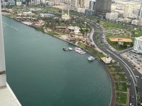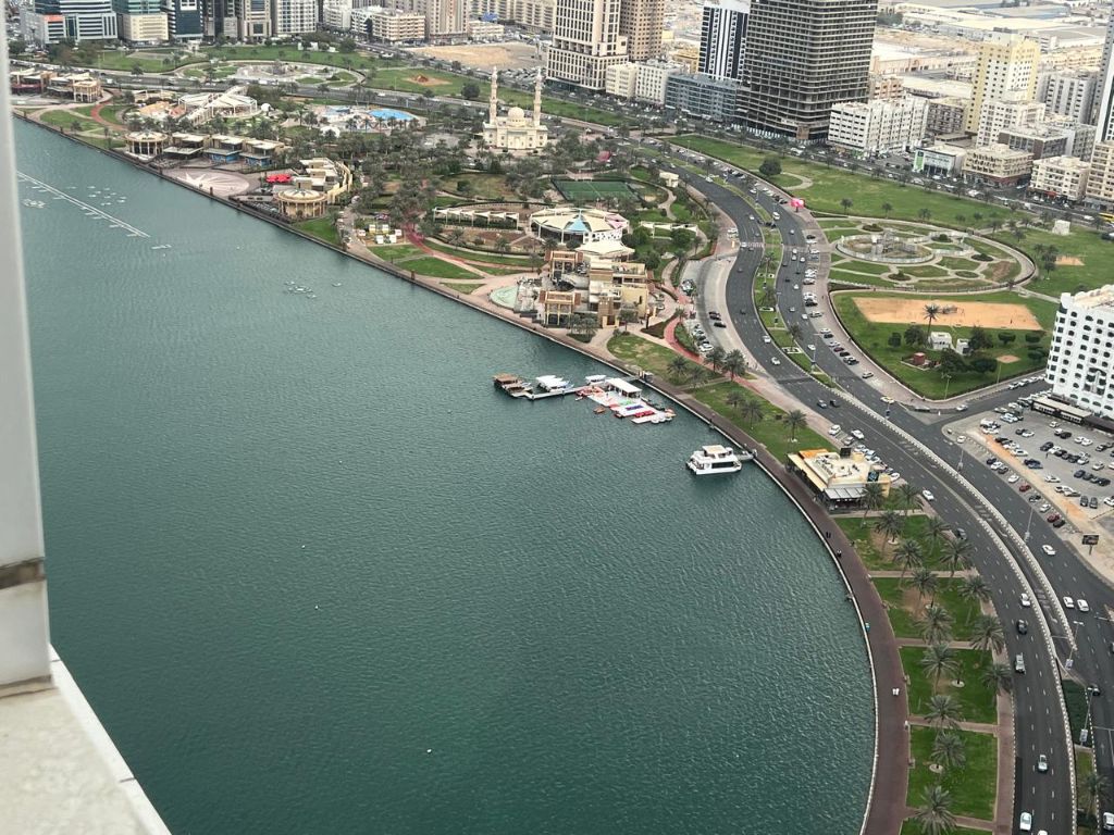 Sea view with parking, gym, and pool. The largest 3 - bedroom apartment with a hall in Al Majaz 3, Sharjah. Apartment Details Three spacious bedrooms, including a master bedroom with built - in wardrobes. Large and comfortable hall suitable for families. Internal room distributor. Laundry room. Large family kitchen with a modern design. Large balcony with an open view of the Corniche and