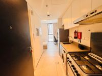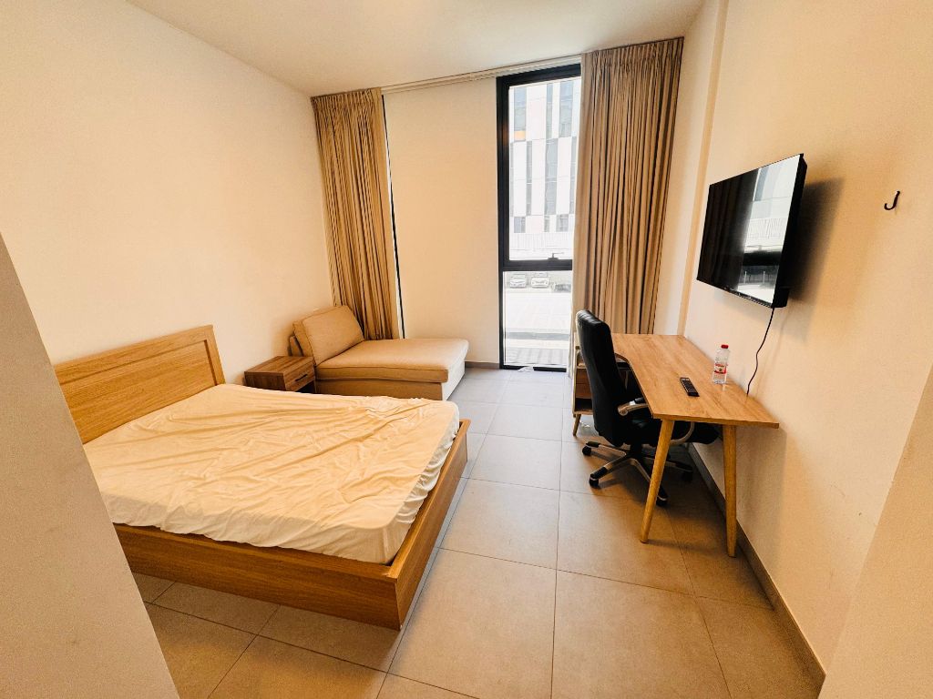 Annual rental in Aljada - New Muwailih 3BR apartment with hotel - style finishes and elegant design. Includes 2 master bedrooms, 3 bathrooms, fully equipped kitchen, built - in wardrobes, central AC & gas, gym, pool, parking, and maintenance covered by the landlord. Prime location with flexible payment options. Contact us for more details