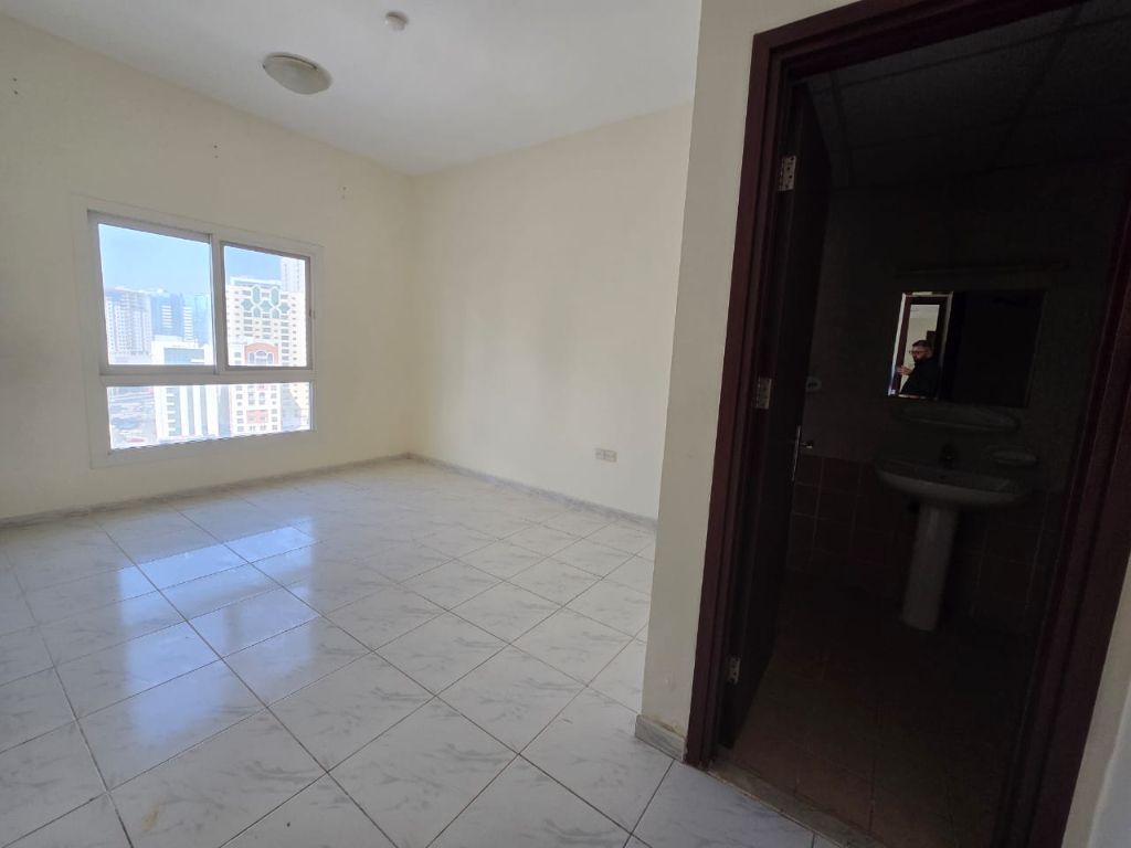 A 2BR apartment in Al Majaz 2 with no balcony, featuring a pool, open view, 3 bathrooms, and a master bedroom. Parking available for 3000 yearly. Deposit can be deferred for one month. Price reduced from 45000 to 42000. Last unit of the double - balcony layout, rented per building requirements