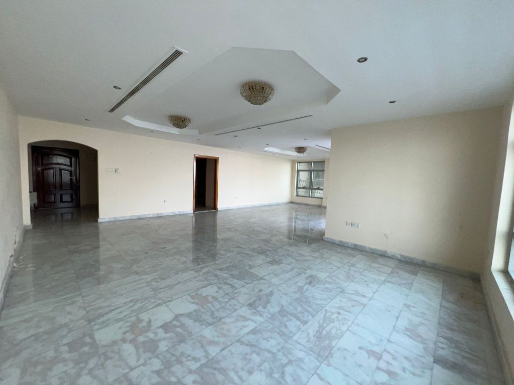Annual rent apartment in Al Majaz 3, Corniche, with lake view. It includes three master bedrooms, a living room, terrace, parking, built - in storage, six bathrooms, a master maid’s room, laundry room, large foyer, extra kitchen storage, gym and pool access. Price AED95000 yearly