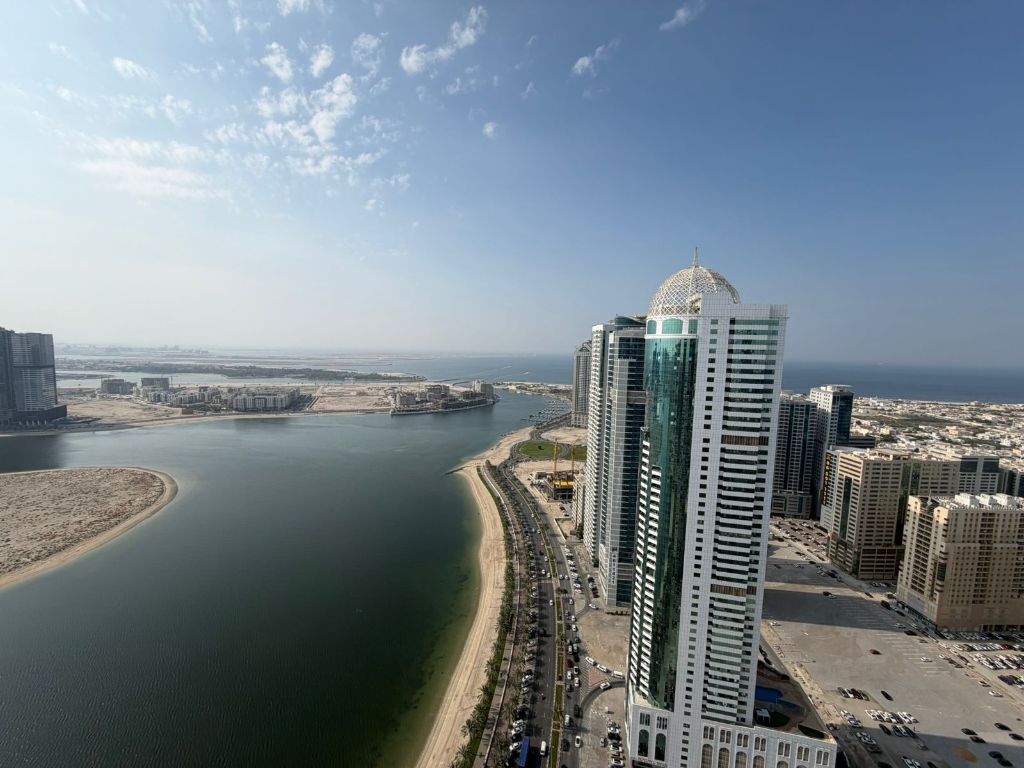 For annual rent in Sharjah - Al Mamzar Two bedrooms and a living room with spacious areas sea view Maid’s room Built - in wardrobes Free parking Balcony Price AED90000 Very large spaces Well - distributed layout 4 bathrooms Large kitchen Prime location Close to Dubai exit Flexible payment options Modern finishing Family - only residential tower Free maintenance service 24/ 7 cleaning service Close to all