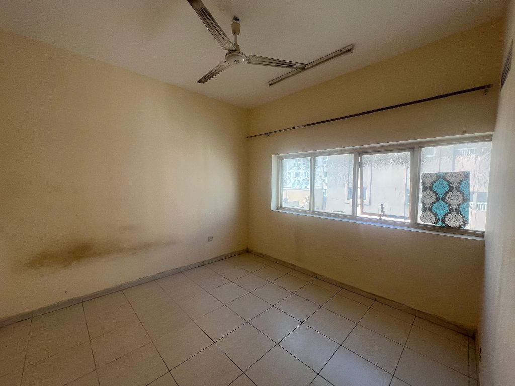 A one - bedroom apartment with a living room in Al Musalla, featuring a sunny balcony, a clean kitchen and bathroom, and good finishing. Surprise price Annual rent AED28000, with flexible payment options in 4 cheques