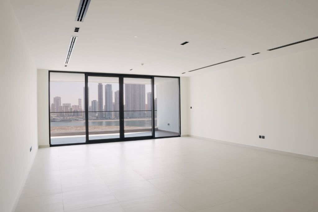 Luxury apartment for rent in Al Khan Lagoon featuring a stunning sea view, complete privacy, and spacious layout. The apartment is ready to move in and includes three master bedrooms, all with en suite bathrooms, plus a maid’s room. It offers five bathrooms, large living areas, and a bright, spacious balcony. Total area is 3627 SqFt, with two parking spaces. The building provides premium facilities
