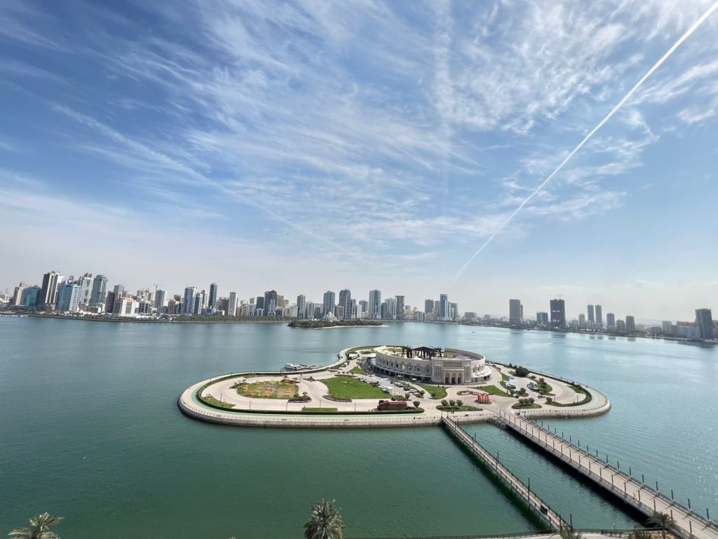 For well - being and tranquility in Al - Majah 3 in Sharjah, 4 rooms and a lounge, a maid's room, a laundry room, 5 bathrooms, 2 balconies, wall cabinets, free air conditioning, gym, swimming pool, sea view, large spaces, close to all services, with facilities in payment up to 4 payments, the price is 115 thousand per year