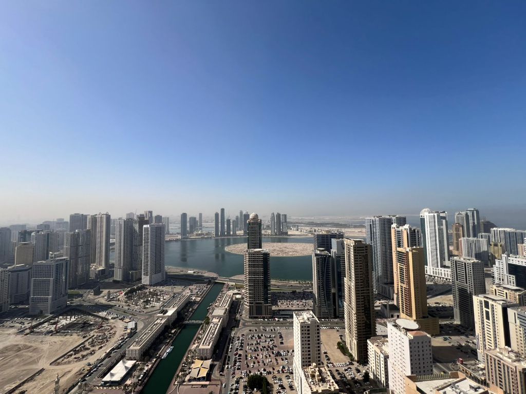 For annual rent in Sharjah - Al Qasba Direct sea view apartment with free gym, pool, and private parking. Two bedrooms and a spacious living room, balcony with direct open sea view, separate kitchen with cabinets, 2 modern bathrooms, free maintenance & cleaning, super deluxe finish, close to all central services, with flexible payment plans