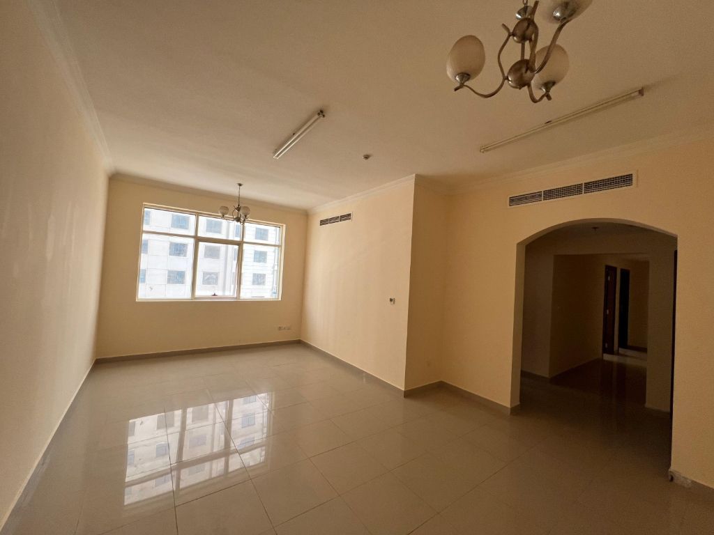 The best - priced 2 - bedroom apartment with a living room in Al Khan, directly on Dubai exit, featuring an internal corridor, energy - saving central air conditioning, and a separate modern - designed kitchen, priced at only 43000, with flexible payment options up to 4 installments and free periodic maintenance before handover