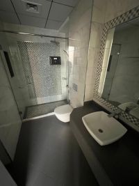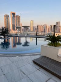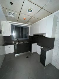 For rent in Sharjah, Al Mamzar area, Al Taawun 2 bedrooms, living room, 3 bathrooms, balcony, kitchen, storage room, side view. rent AED80000. Payment in 4 installments. Includes gym, parking, and family swimming pool