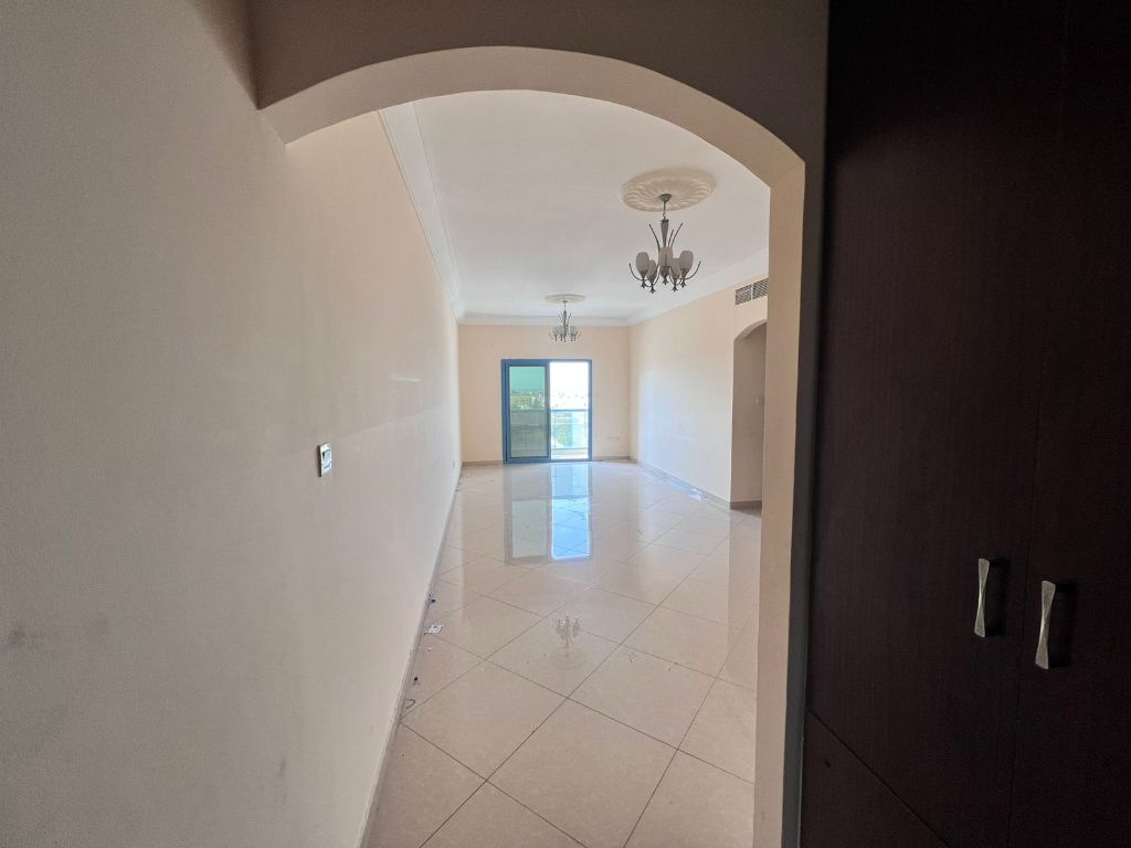 One - bedroom apartment with living room for annual rent in Al Taawun, featuring very spacious layout and super deluxe finishes in a new luxury tower with free maintenance. Includes a large balcony with open view, modern bathroom, and closed kitchen with cabinets. Bright unit with central AC, free internet, and 24 - hour security. Prime location near the Corniche, close to schools, hospitals, restaurants