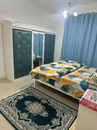 Furnished one - bedroom apartment with a living room and balcony for rent in Al Taawun, including internet