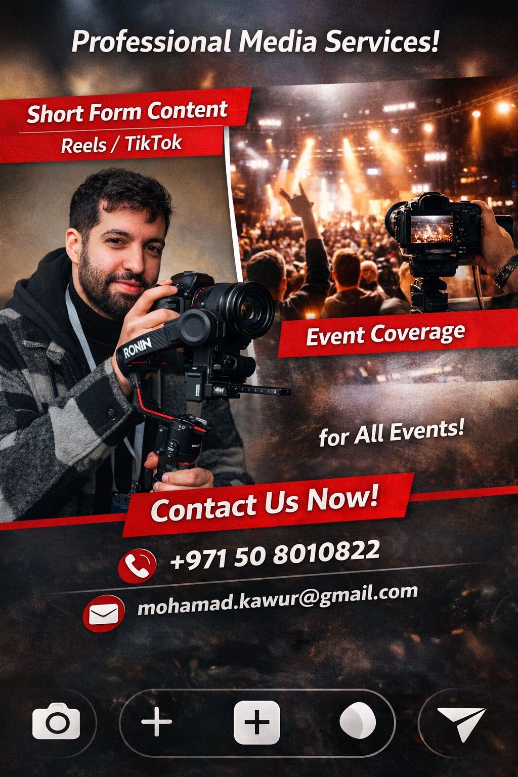 أنا مصور محترف أستطيع القيام بترندات الريلز والتيك توك وتصوير الايفنتات وكذلك العيادات وشركات تأجير السيارات وادارة حسابات السوشيال ميديا