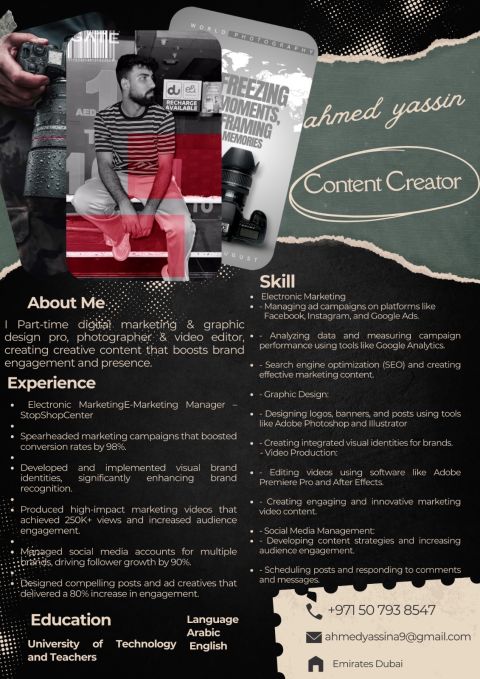 Ahmed Yassin Content Creator مش مجرد صانع محتوى أنا بصنع هوية، تأثير، ونتائج حقيقية تصوير احترافي مونتاج فيديو ابداعي جرافيك ديزاين تسويق الكتروني وإدارة حملات اعلانية خبرة في إدارة السوشيال ميديا حملات حققت نسب تفاعل وتحويل عالية محتوى يوصل، يقنع، ويبيع دبي - الامارات + لو محتاج محتوى يفرق معاك فعلا أنا جاهز