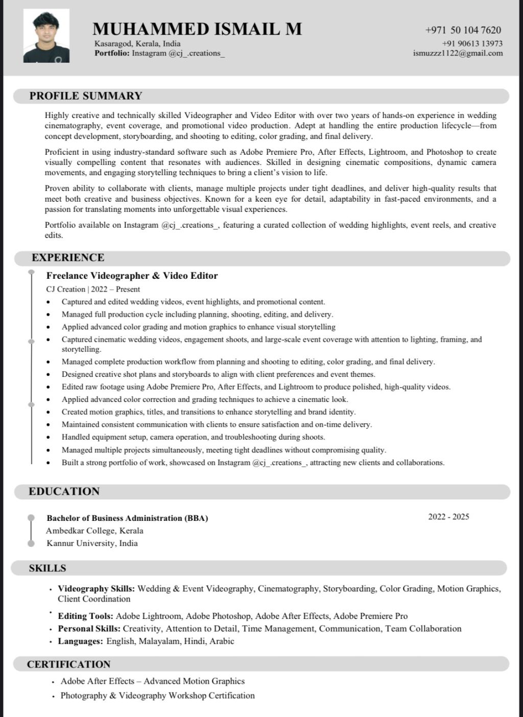 Am currently in UAE in Sharjah am looking for a videography role at anywhere in UAE, I have good editing and videography skills and little designing skills you can check my portfolio at Instagram Cj creation