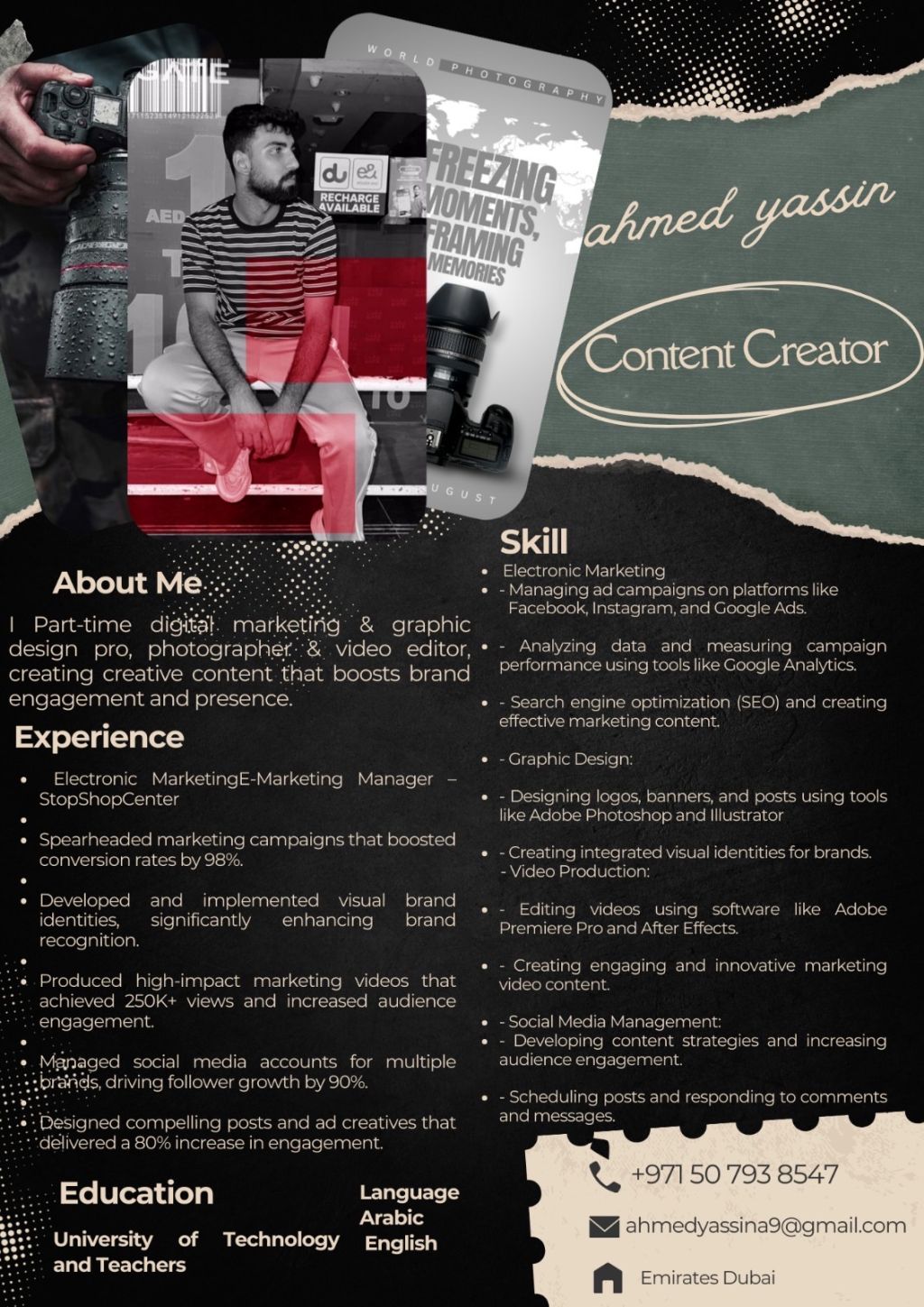 Ahmed Yassin Content Creator Creative content creator specialized in photography, video editing, graphic design, and digital marketing. Experienced in social media management and ad campaigns that drive engagement and real results. Based in Dubai, delivering content that builds strong brand identity and growth. Dubai, UAE