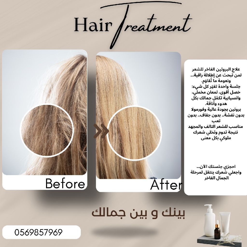تألقي بشعر ناعم حر يري من أول جلسة جربي بروتين الشعر المتطور اللي يعالج التقصف والهيشان ويعيد لشعرك قوته ولمعته النتيجة شعر سهل التصفيف، بدون نفشه، ثابت ومخملي الملمس مناسب لكل أنواع الشعر - حتى التالف منها خصم 50% لفترة محدودة فقط احجزي الآن قبل ما يخلص العرض للحجز والتواصل الرسائل الخاصة