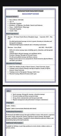 Fitness and bodybuilding trainer, sheets and plates, in addition to that, he specializes in sports and therapeutic massage and massage Omar I am 23 years old. I used to work in tourist resorts and gyms and supervise the training of many youth teams. I am a final year student in the College of Sports Sciences and I am present in Abu Dhabi. I have no objection to working privately