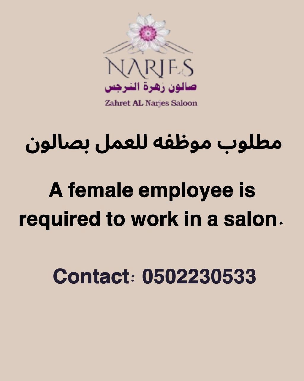 مطلوب موظفة للعمل بصالون نسائي أخصائية شعر وأخصائية اظافر ورموش في الشارقة الناصرية بعد مستشفى زليخة