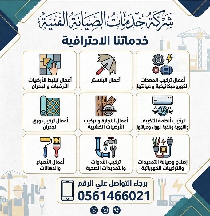 أعمال صيانة عامة للمباني والفلل نعتني بمنزلك وكاننا نبنية من جديد تركيب السيراميك وخدمات التبليط الكامل - أعمال النجارة والأرضيات الخشبية - تركيب ورق الحائط - أعمال البلاستر - أعمال الدهانات والأصباغ الداخلية والخارجية - تركيب وصيانة المكيفات - تركيب السباكة والأدوات الصحية - اصلاح وصيانة التمديدات الكهربائية - نحن في خدمتكم علي مدار الساعة. لا تتردوا بالاتصال بنا - عمالة فنية متخصصة والتزام