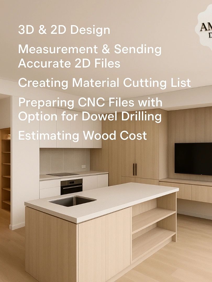 We offer 3D design services for kitchens, dressing rooms, and all decorative woodwork. Our service includes high - quality professional renderings for clients, as well as the creation of custom 2D plans for manufacturing. Additionally, we provide comprehensive factory services, including cutting lists, CNC files for automated cutting, and precise drilling for each piece