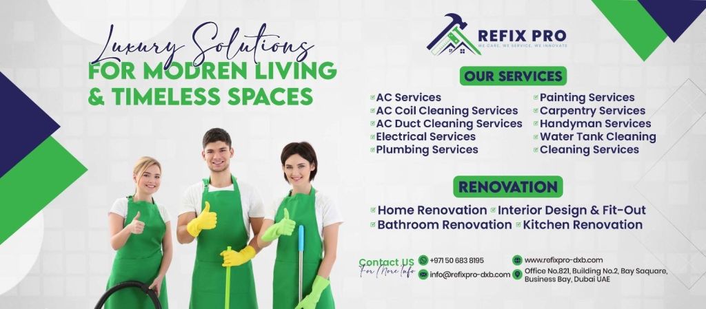 REFIX PRO provides comprehensive maintenance services for apartments, villas, offices, and shops across UAE. Our services include AC maintenance, electrical work, plumbing, painting, carpentry, handyman services, and general cleaning. We also offer bathroom and kitchen renovation and full apartment renovation. Professional team, fast execution, and competitive prices. Serving all areas of UAE