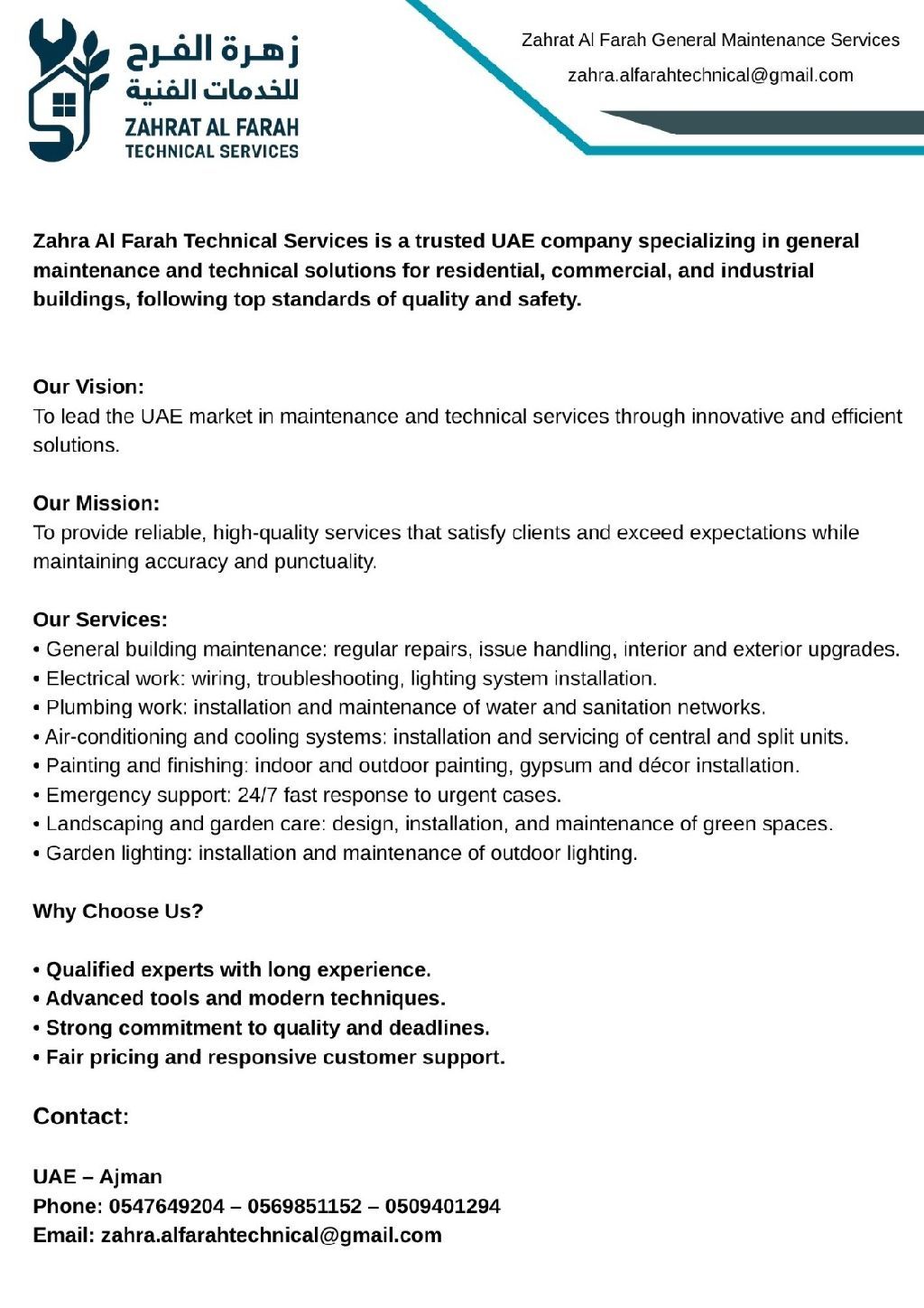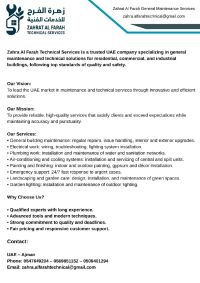 شركة زهرة الفرح للخدمات الفنية هي شركة اماراتية رائدة في مجال الصيانة العامة والخدمات الفنية تقدم حلولا متكاملة للمباني السكنية والتجارية والصناعية، وفق أعلى معايير الجودة والسلامة