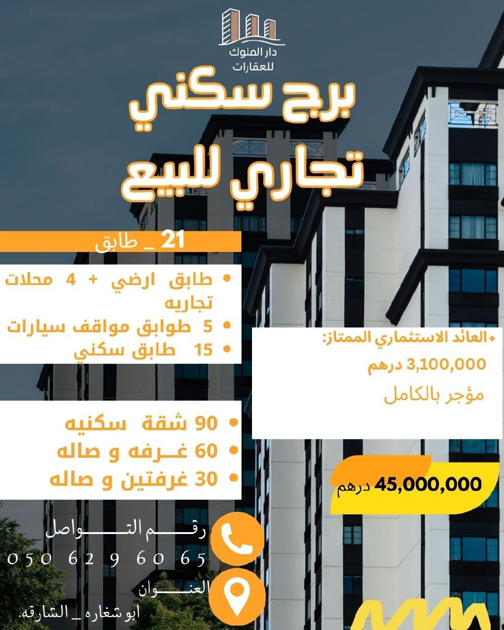 برج سكني تجاري للبيع - فرصة استثمارية مميزة في قلب الشارقة الموقع إمارة الشارقة - منطقة أبو شغارة المساحة 930م (10000 قدم مربع) مواصفات البرج عدد الطوابق 21 طابق 1 طابق أرضي 15 طابق سكني 5 طوابق مواقف سيارات 4 محلات تجارية تفاصيل الوحدات السكنية 60 شقة (غرفة وصالة) 30 شقة (غرفتين وصالة) عدد الشقق 90 شقة عمر البرج سنتان تقريبا الحالة مؤجر بالكامل