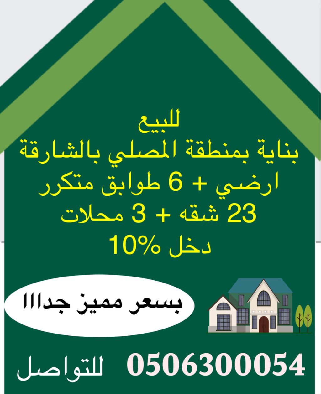 للبيع بناية بمنطقة المصلي في الشارقة أرضي + 6 طوابق بدخل 10% للتواصل