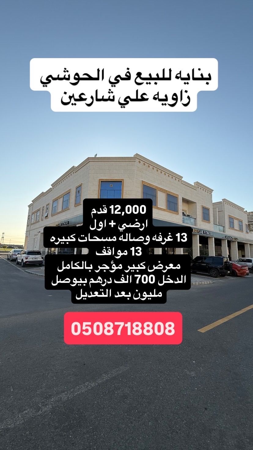 بناية الحوشي زاوية علي شارعين ثاني قطعة من مليحة 12000 قدم أرضي + أول 13 غرفة وصالة مساحات كبيرة 13 مواقف معرض كبير مؤجر بالكامل الدخل 700 ألف درهم بيوصل مليون بعد التعديل تواصل للاستفسار والمعاينة طلعت يوسف البصمة للعقارات