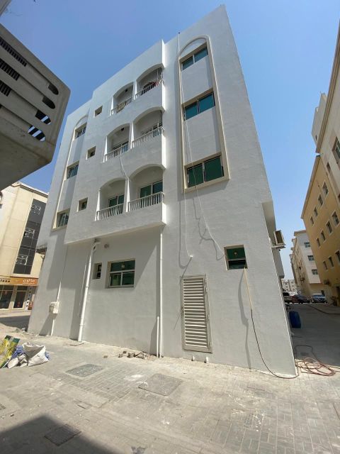 For sale, a new residential/ commercial building, the first resident in Sharjah, Muwailih area, formerly Falah Camp, a distinguished location, corner of two streets, ground floor + 4 repeated floors + 9 shops, number of apartments 28 apartments consisting of 20 apartments, one bedroom and a hall + 8 apartments, two bedrooms and a hall, current income one million dirhams, land area 8100 square feet