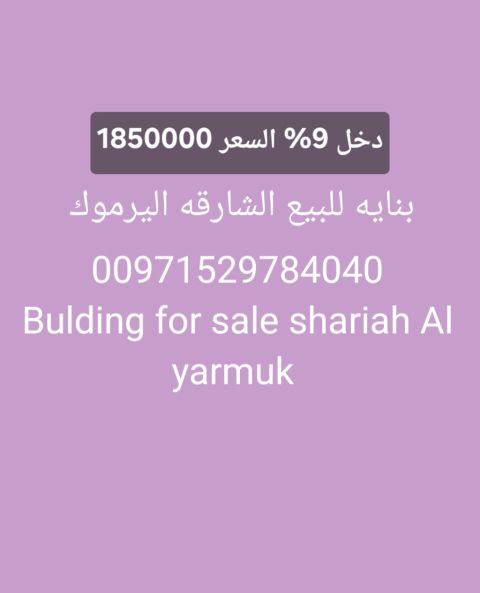 For sale Building in Maysaloon area, land area 2500 SqFt 7 apartments 6 bedrooms and a living room 1 studio Paved street Excellent location behind the Directorate and next to the mosque Equipped with security cameras and access code for tenants Complete building maintenance has been completed Current income 100000 Projected income 120000 asking price 1500000