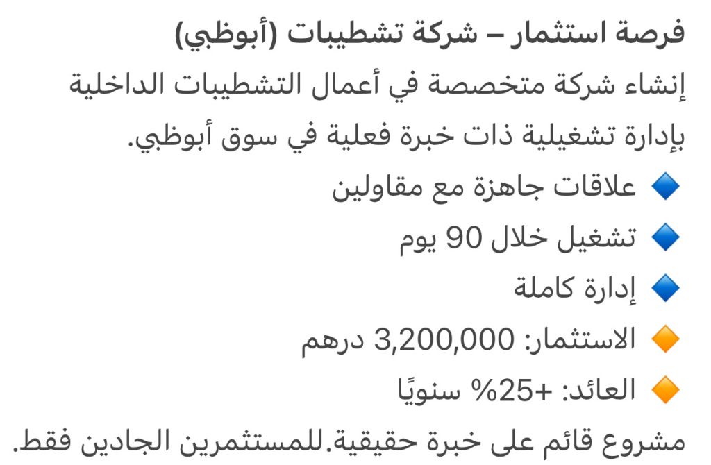 فرصة استثمار - شركة تشطيبات (أبوظبي) انشاء شركة متخصصة في أعمال التشطيبات الداخلية بإدارة تشغيلية ذات خبرة فعلية في سوق أبوظبي. علاقات جاهزة مع مقاولين تشغيل خلال 90 يوم إدارة كاملة الاستثمار 3200000 درهم العائد 25% سنويا مشروع قائم على خبرة حقيقية. للمستثمرين الجادين