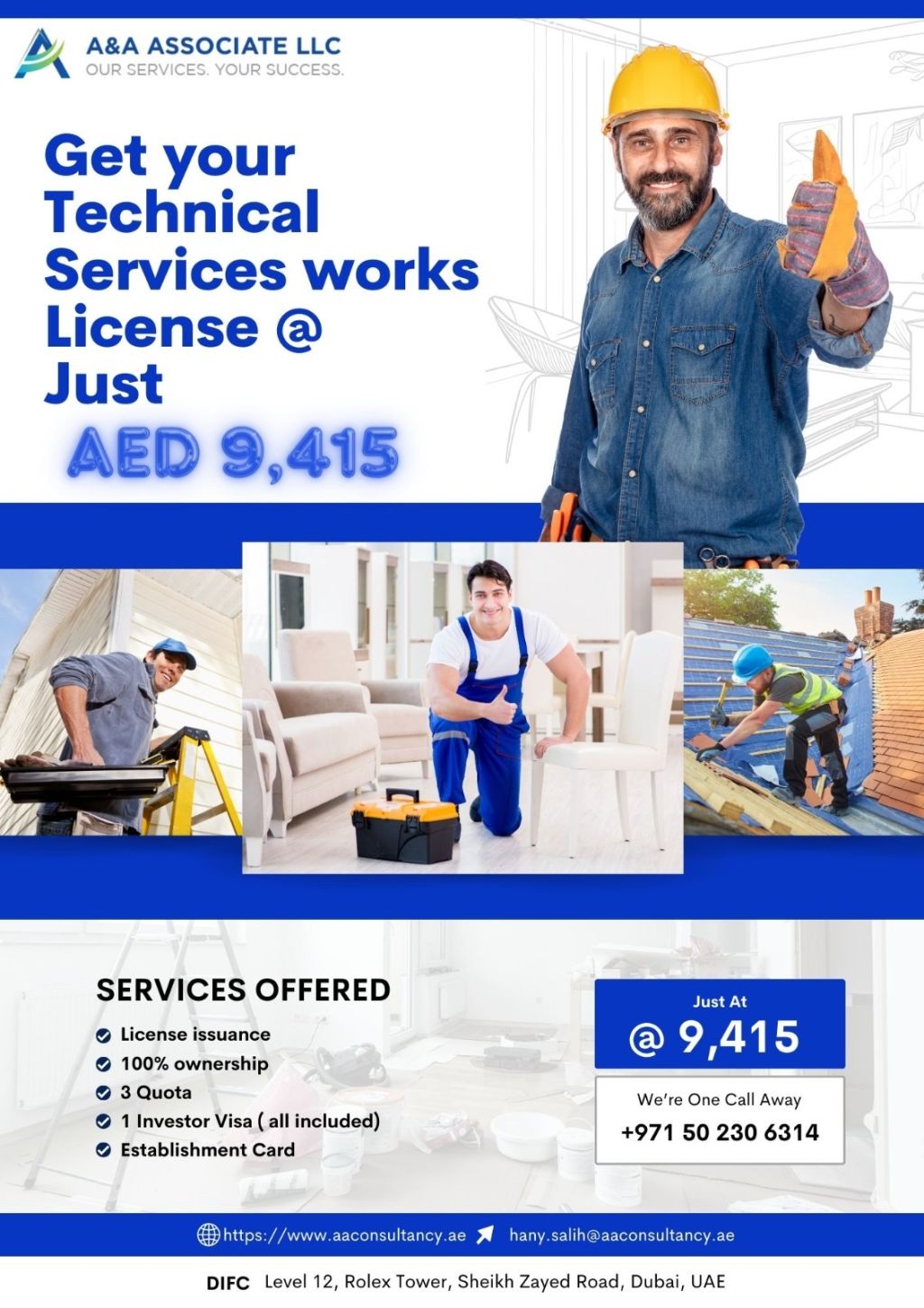 احصل علي رخصة خدمات الأعمال الفنية وصيانة المباني من دبي فقط 9415 تشمل التالي الرخصة المهنية إقامة المستثمر 4 - 5 حصص كوته مجانا بطاقة المنشأة من الجوازات