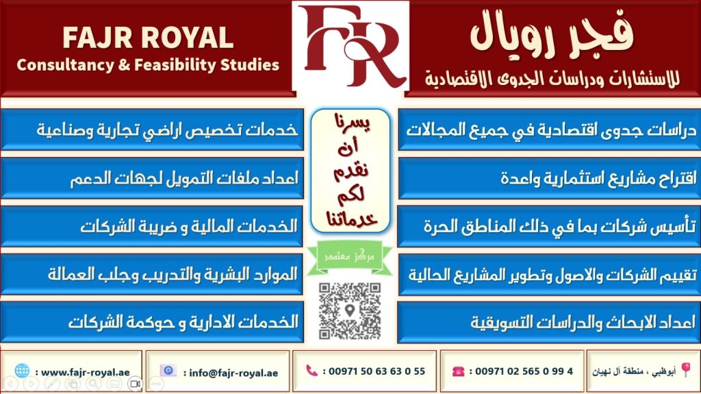 يسرنا نحن "فجر رويال للاستشارات ودراسات الجدوى الاقتصادية" أن نقدم خدماتنا دراسات الجدوى الاقتصادية في جميع المجالات. اعادة تقييم وتطوير المشاريع الحالية. خدمات أبحاث السوق. تخصيص أراضي تجارية وصناعية. تأسيس شركات. اقتراح مشاريع وفرص استثمارية واعدة. جميع الخدمات والاستشارات المالية. خدمات الموارد البشرية وجلب العمالة. الاستشارات الادارية والاقتصادية