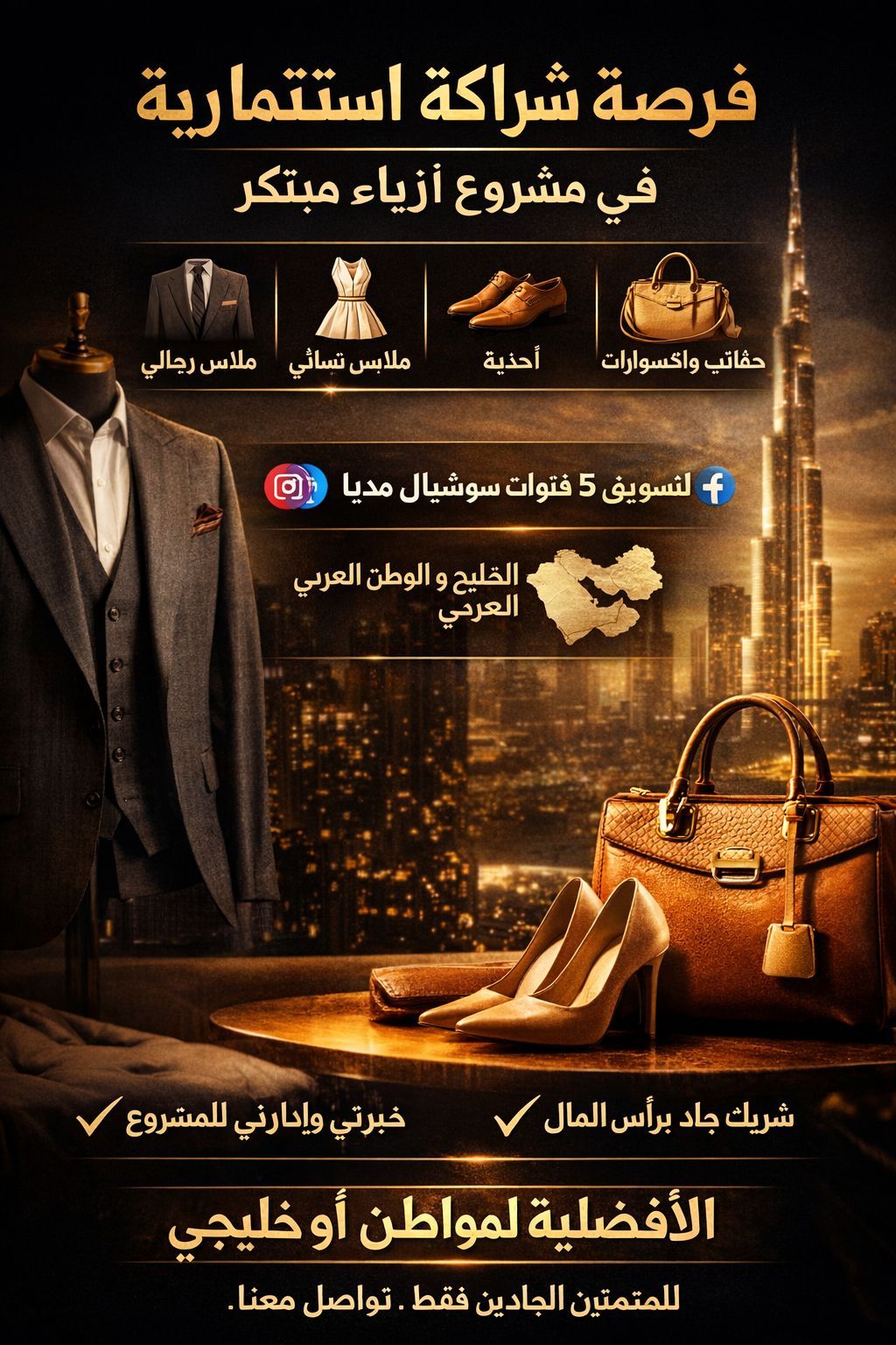 شراكة استثمارية في مشروع أزياء مبتكر خارج الاطار والتسويق عبر السوشيال ميديا وأني لدي خبرة في مجال الأزياء وأيضا لدى خبرة عبر قنوات السوشيال ميديا أريد شريك جاد هو برأس مال وأنا بخبرتي العملية وأنا لا استلم أي مال اطلاقا