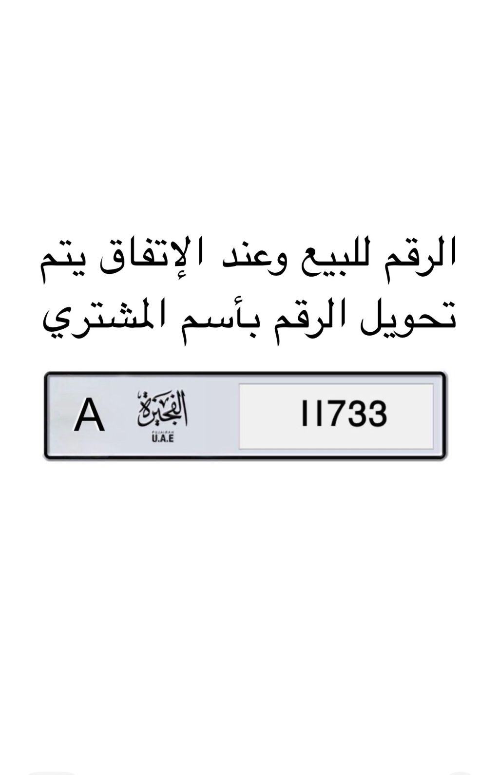 رقم مميز ونادر للبيع (11733) الفجيرة A وعند الاتفاق من قبل المشتري يتم تسجيل الرقم باسم الشخص المشتري من قبل ادارة المرور والترخيص في الفجيرة ويسلم ورقة حيازة الرقم باسمة وقانونية