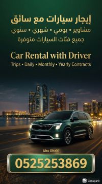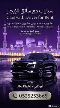 يوجد لدينا جميع السيارات للإيجار مع السائق خدمة إيجار مميزه يومي أو شهري أو سنوي مقرنا في أبوظبي أسعارنا مناسبة لجميع