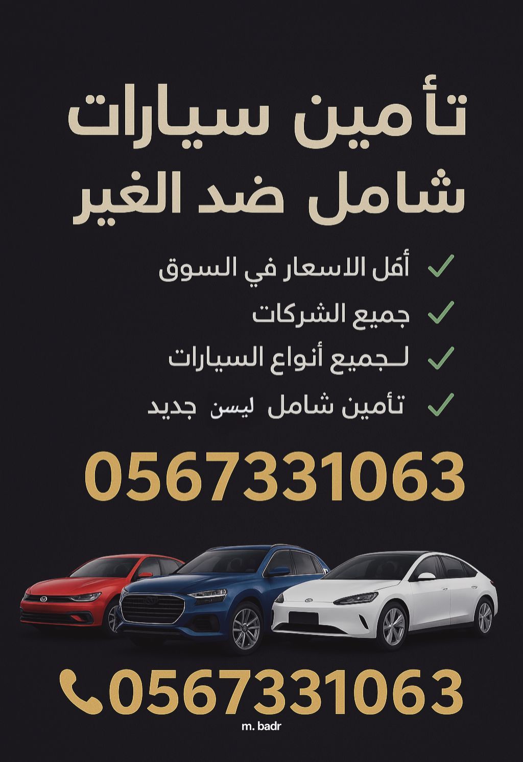 متاح تأمين للسيارات بأرخص الأسعار تأمين شامل وضد الغير لجميع أنواع السيارات ويوجد تأمين للعمر صغير وليسن جديد لجميع أنواع السيارات