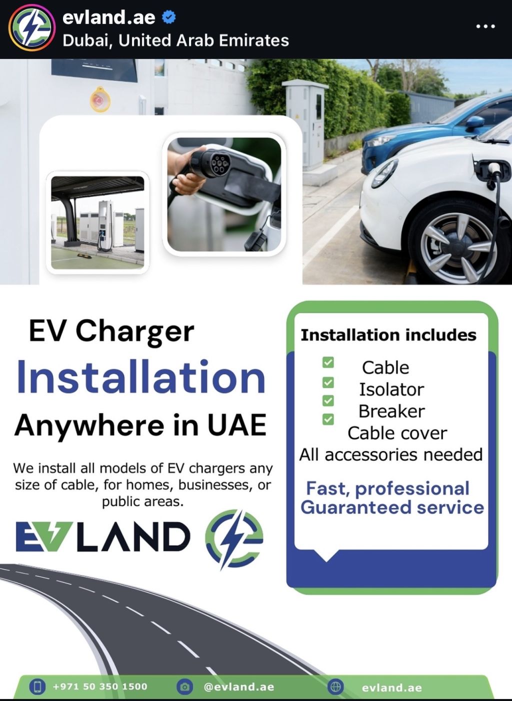 EVLAND delivers end - to - end EV charging solutions across the UAE. We handle professional charger installation, and we offer a full range of EV chargers, adapters, and accessories. Fast service, reliable products, and complete nationwide coverageEVLAND keeps your EV powered and ready