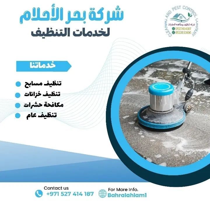 شركة بحر الأحلام لخدمات التنظيف والتعقيم ومكافحة الحشرات في الامارات تنظيف عام للفل والشقق وأطقم الكنب والسجاد والستائر والموكيت وجلي وتلميع الرخام بالكريستال وازالة الدهون من المطابخ وتنظيف وتعقيم خزنات المياه