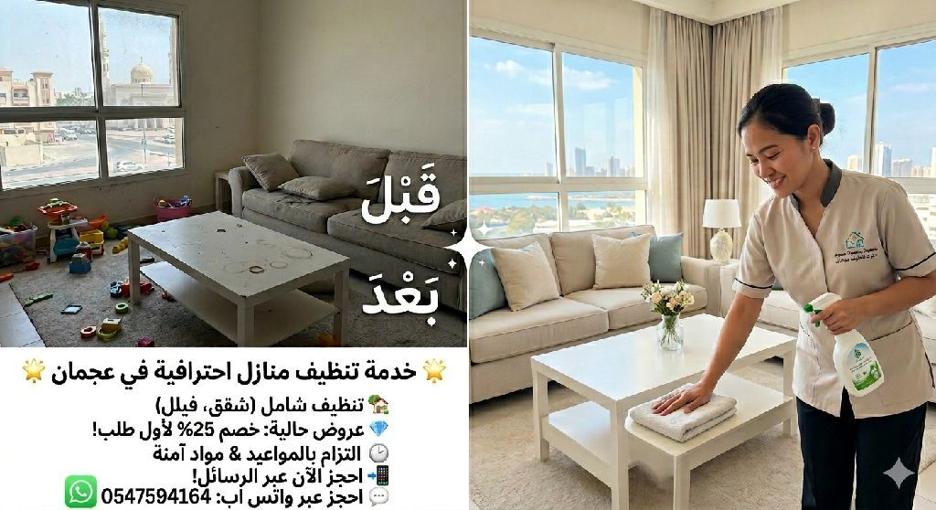 خدمة تنظيف منازل احترافية نقدم تنظيف شامل للشقق والمنازل والفلل بأسعار مناسبة وخدمة عالية الجودة عروضنا الحالية خصم 25% لأول طلب ساعة اضافية مجانية عند حجز 4 ساعات تنظيف عميق وتعقيم بأسعار خاصة نركز على التفاصيل مطابخ - حمامات - أرضيات كل زاوية في البيت التزام بالمواعيد مواد تنظيف آمنة وفعالة رضا العميل أولويتنا احجز الآن عبر الواتساب العرض لفترة محدودة