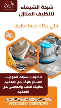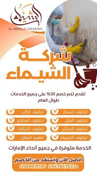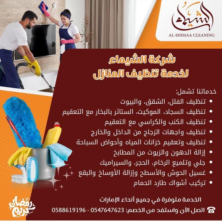 شركة الشيماء لتنظيف المنازل جميع الامارات تنظيف فلل وشقق تنظيف سجاد وكنب بالبخار تنظيف زجاج وأرضيات وجلي رخام بالكريستال وتعقيم شامل بأفضل المواد خدمة سريعة أسعار مناسبة عمالة مدربة اتصل الآن