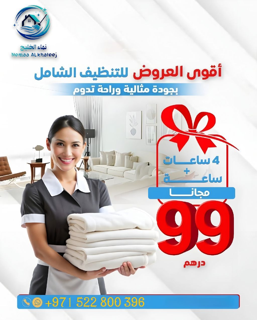 شركة نماء الخليج لخدمات التنظيف المتكاملة في الامارات نقدم لكم خدمة تنظيف احترافية بمعايير عالية، تنفيذ بأيدي عاملات مدربات ومتابعة إشرافية مستمرة لضمان الجودة. خدماتنا تنظيف المنازل والشقق تنظيف المكاتب والشركات تنظيف وتعقيم شامل تنظيف الكنب والسجاد والمجالس تنظيف الزجاج والأرضيات توفير مواد التنظيف عند الطلب
