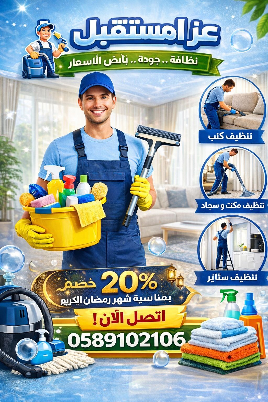 محتاج بيتك يلمع قبل رمضان شركة عز المستقبل بتنور لك بيتك بأعلى جودة وأرخص الأسعار تنظيف كنب، سجاد، ستائر، مطابخ وأرضيات باحترافية تامة. وخصم 20 بمناسبة شهر رمضان الكريم اتصل دلوقتي واحجز معنا وخلي بيتك يستقبل رمضان وهو في أبهى صورة