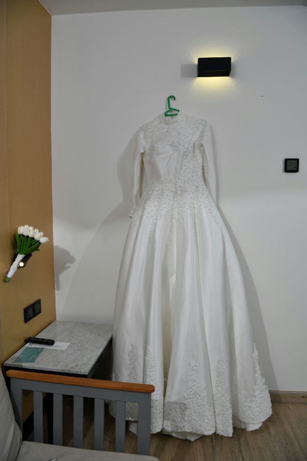 فستان عرس مستعمل لمرة واحدة مع جيبون وطرحة لمقام XS للبيع المستعجل