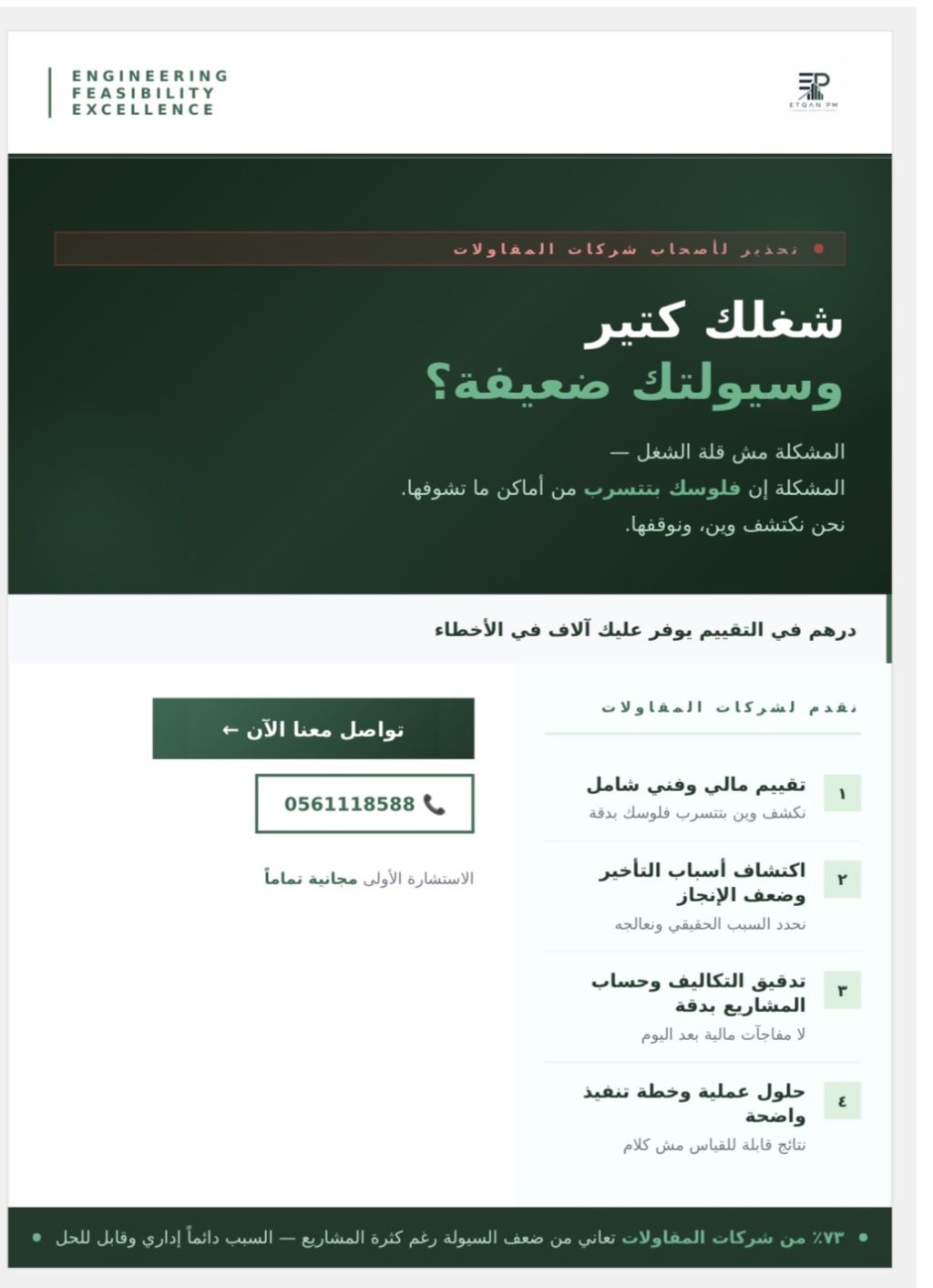 شغلك كثير وسيولتك مع هيك ضعيفة مشاريعك متأخرة وأرباحك أقل مما تتوقع نحن نكتشف المشكلة قبل ما تكبر. نقدم لشركات المقاولات تقييم مالي وفني شامل اكتشاف أسباب التأخير وضعف الانجاز تدقيق التكاليف وحساب المشاريع بدقة حلول عملية وخطة تنفيذ واضحة درهم في التقييم يوفر عليك آلاف في الأخطاء. تواصل معنا الاستشارة الأولى مجانية