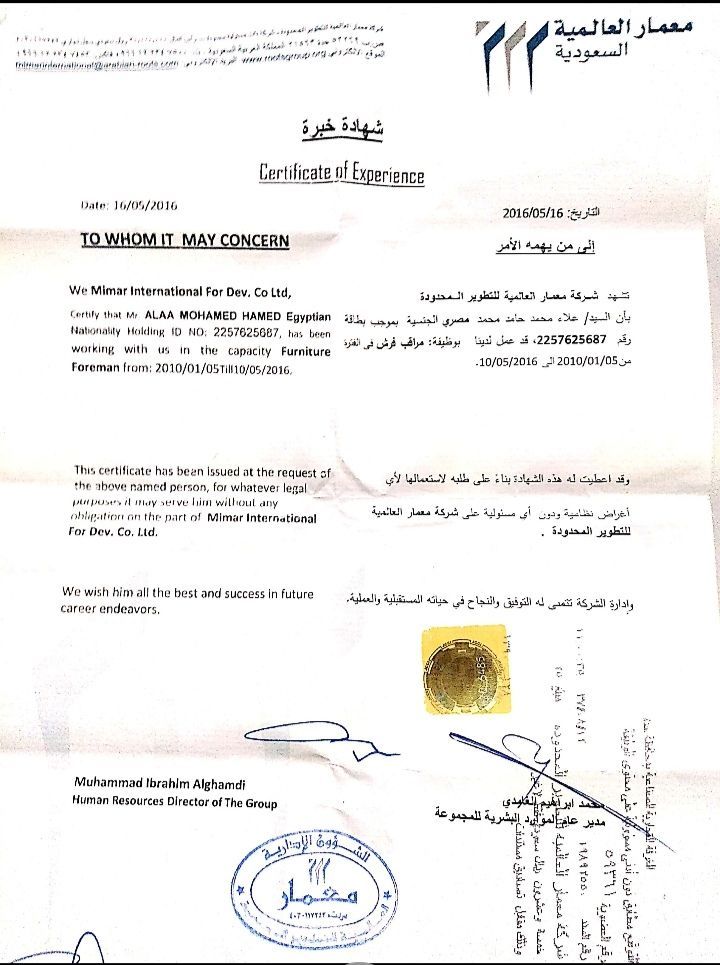ابحث عن وظيفة مراقب عمال لدي شركات المقاولات. حيث أملك من الخبرة 8 سنوات بالعمل لدي مجموعة بن لادن السعودية في مجال الفرش والديكور من خلال شركة (معمار العالمية)