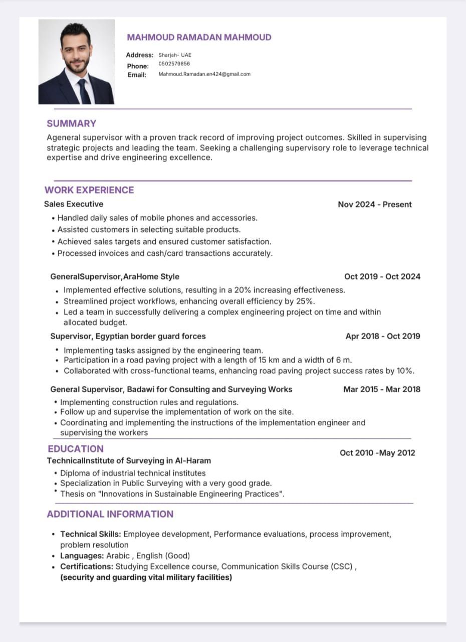 الاسم محمود رمضان الجنسية مصري مقيم الشارقة المؤهل خريج مساحة تقدير جيد جدا شعبة مساحة عامة اللغة الانجليزية جيد الخبرات في مصر مشرف عام بشركة بديوي للاستشارات الهندسية والأعمال المساحية سنتين 2 - مشرف عام في شركة أرا هوم ستايل لتنفيذ المهام بالقوات المسلحة 5 سنوات اشراف هندسي داخل القوات المسلحة سنة خبرات داخل دولة الامارات. مندوب