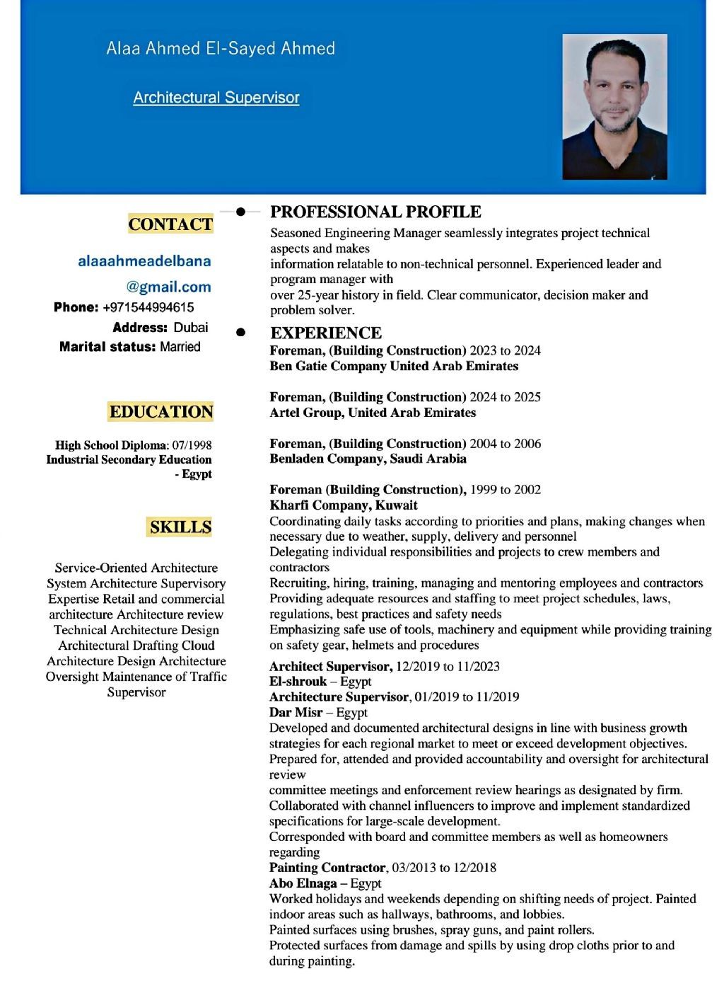 ورحمة الله وبركاته علاء أحمد السيد فورمان تشطيبات خبرة جيده والحمد لله