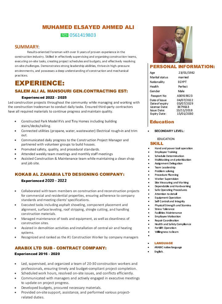 فورمان عام خبرة 10 سنين داخل الدولة يوجد ليسن خبرة في ادارة المواقع والعمال من جميع الجنسيات ومقاول الباطن وقراءة المخطط وتسليم العمل في أسرع وقت ممكن موجود في أبو ظبي يبحث عن عمل مناسب