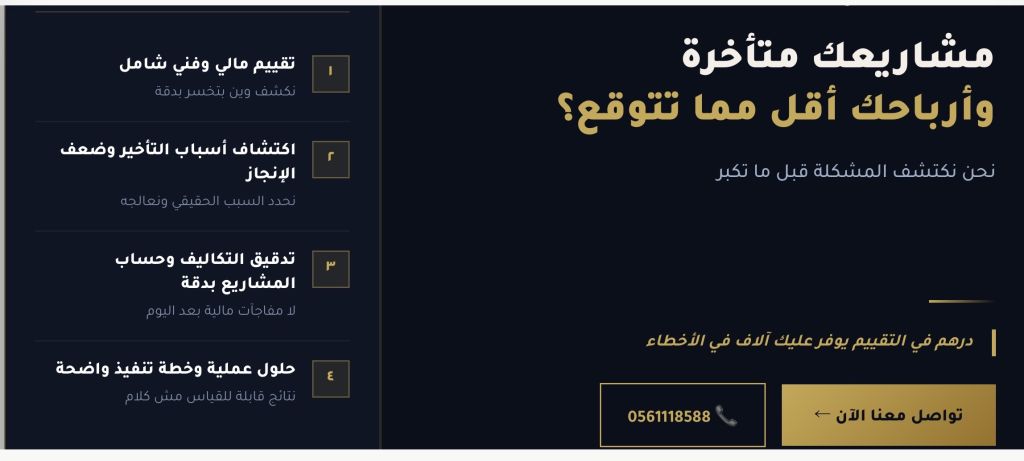 مشاريعك متأخرة وأرباحك أقل مما تتوقع الوصف نحن نكتشف المشكلة قبل ما تكبر. نقدم لشركات المقاولات تقييم مالي وفني شامل اكتشاف أسباب التأخير وضعف الانجاز تدقيق التكاليف وحساب المشاريع بدقة حلول عملية وخطة تنفيذ واضحة درهم في التقييم يوفر عليك آلاف في الأخطاء. تواصل معنا الاستشارة الأولى مجانية