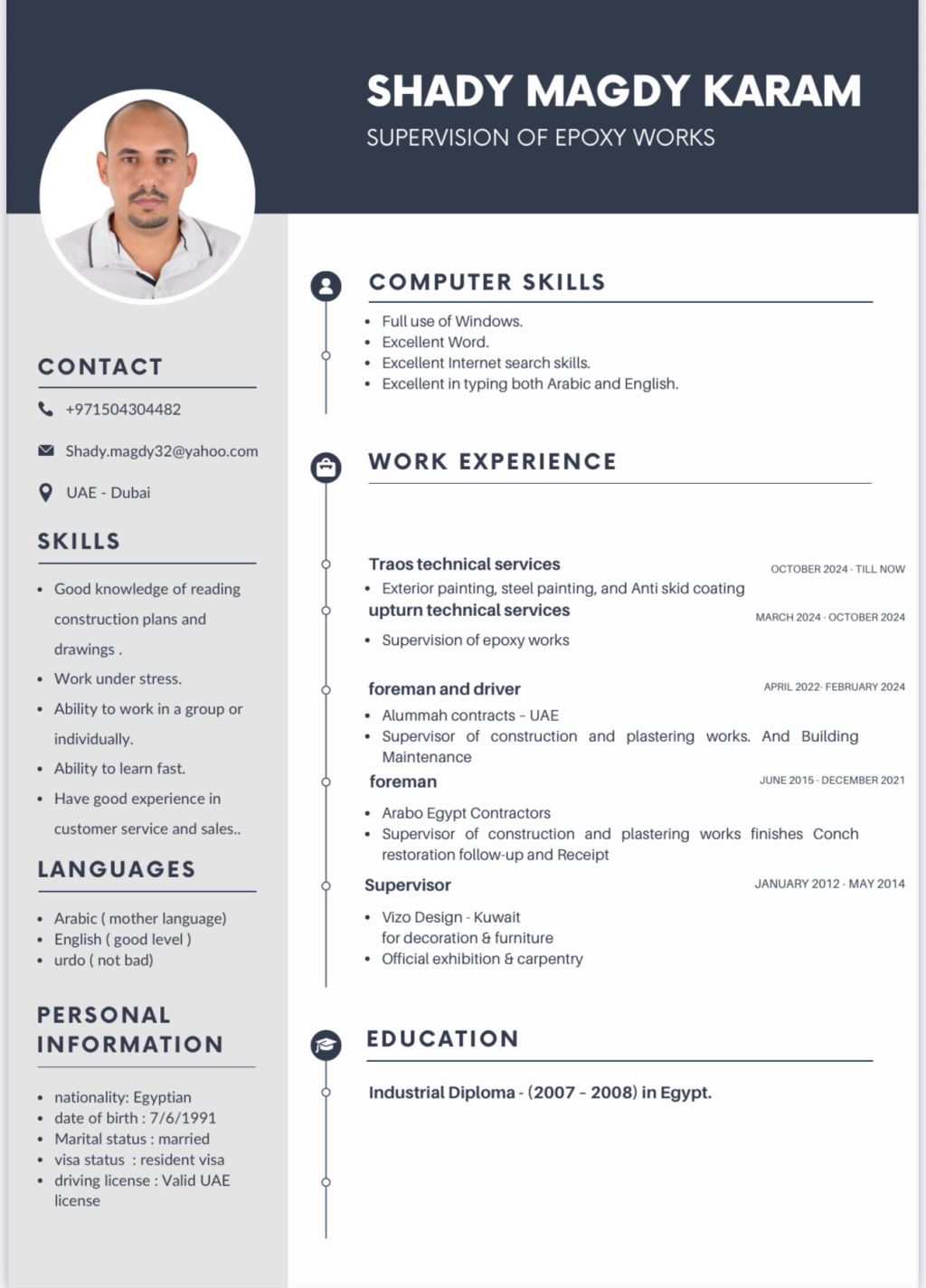 ابحث عن عمل فورمان خبرة 5 سنوات بالدولة وأحمل رخصة قيادة